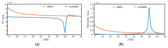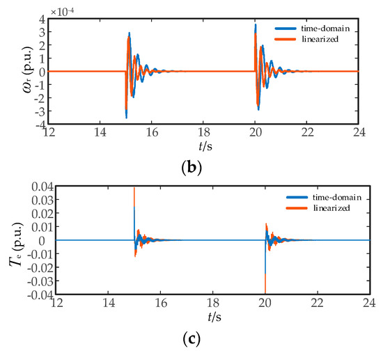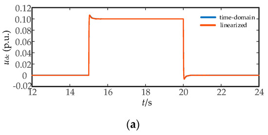 The time domain simulation model and linearized model of detailed DFIG wind farm is constructed, in which the same parameters and operating points are adopted. By setting the DC voltage reference disturbance (t = 15 s, 0.1 p.u. voltage step change is applied; t = 20 s, −0.1 p.u. voltage step change is applied), the matching degree of the results of the two models is compared in Figure 8 to verify the effectiveness of the model.