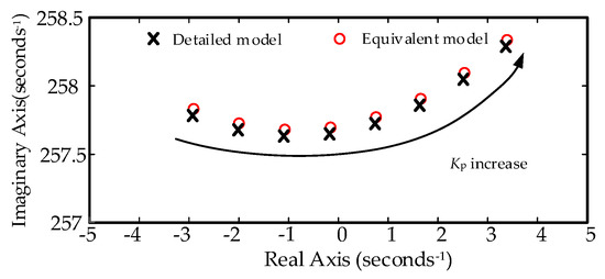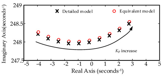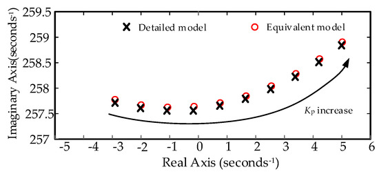 Case 1: 20 DFIG turbines have the same number (the multiplier of each turbine is 100) and the collecting lines are not considered, the validity of the equivalent model under SSR is analyzed by changing the RSC current inner loop control parameter kP. When kP is between 0.01 p.u. to 0.1 p.u., the results of dominant oscillation eigenvalues of the detailed model and equivalent model are shown in Figure 9.