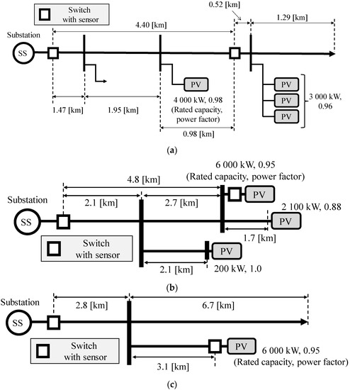 Sample MV feeders with the PV system in the Kyushu area of Japan were extracted for measurement of voltage. The nominal voltage is 6.6 kV. As an example, a single line diagram for three of the sampled distribution feeders is presented in Figure 1.