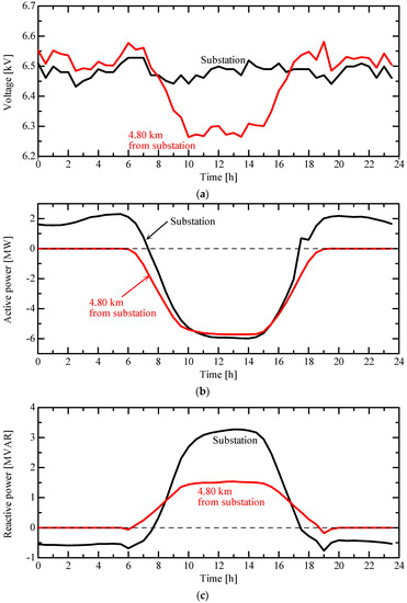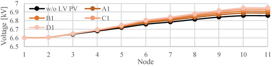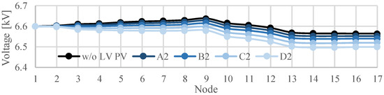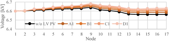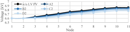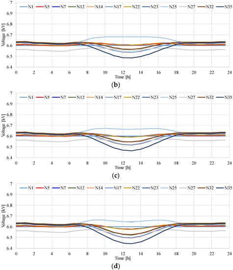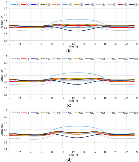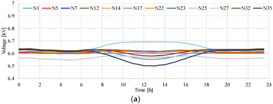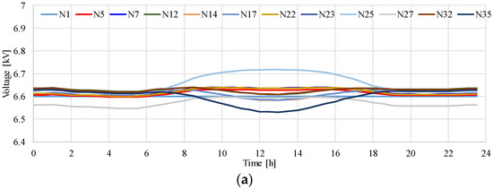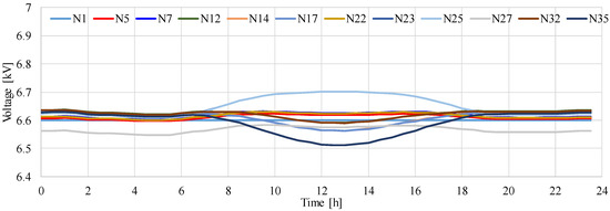 Figure 9 presents the time variation in the voltage in the MV distribution system model shown in Figure 5. The results illustrate that the voltage at several nodes decreases with an increase in the output of the PV systems in the MV distribution system presented in Figure 5. The maximum voltage reaches 6.70 kV. It was found that the minimum voltage during the 24-h period drops to 6.51 kV when the amount of solar radiation is at its maximum. The difference between the maximum and minimum voltage is 0.19 kV.