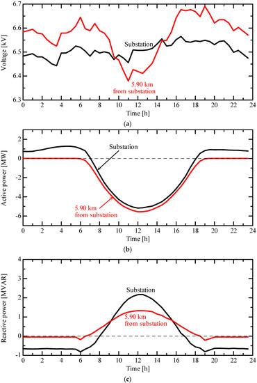 Figure 2 presents the measured voltage, active power, and reactive power in distribution feeder A shown in Figure 1a.