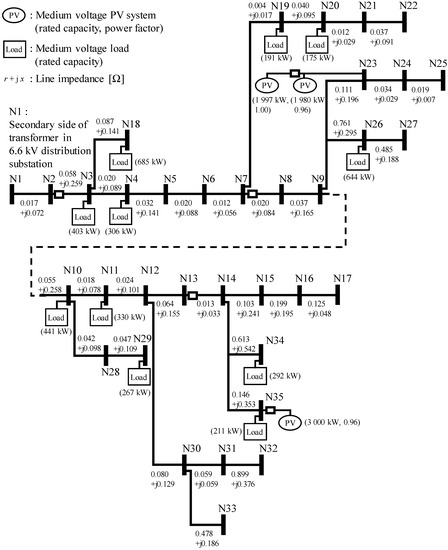 Figure 5 presents a detailed one-line diagram of the three-phase 6.6-kV MV distribution system model that corresponds to the actual distribution feeder shown in Figure 1a. Node N1 expresses the secondary side of the transformer in the distribution substation. Large capacity PV systems are connected to nodes N23 and N35. Several nodes in the figure have the MV loads corresponding to the factory loads, while the other nodes have the LV distribution system of which the capacities are listed in Table 1. The line impedance shown in Figure 5 is estimated from the actual line material, thickness, length, and arrangement.