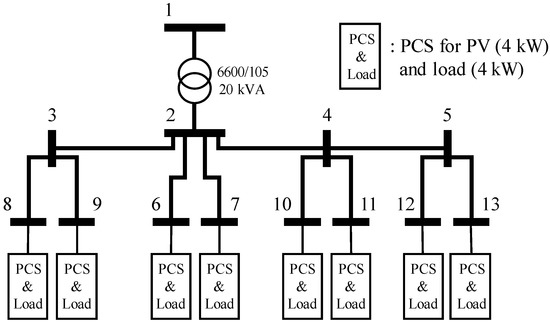 The total capacity of PCS in the LV distribution system depends on the number of customers with PV systems. The PCS consists of a DC/DC converter and inverter, which converts from DC power generated by the PV module to AC power. The capacity of PCS per customer is 4 kW. Because the amount of the LV distribution system connected to the MV distribution system depends on the load capacity shown in Table 1, the total capacity of the PCS installed in the distribution system can be changed by the number of customers with the PV system, as presented in Table 3.