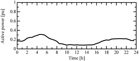 The time variation in the active power supplied to the load in the LV distribution system was modeled based on the measured value in the actual MV distribution line. Sensors were installed on the feeder that supplies power to the residential area, and the time variation in active power was measured. The time variation in the active power of the load model was obtained and expressed per unit, as shown in Figure 7, by selecting the total load capacity of the LV distribution system in the measured feeder as the base power. The reactive power of the load in the LV distribution system was excluded because it was sufficiently smaller than the active power in the LV distribution system in Japan. Therefore, the effect of the constant power factor control of PCS on the voltage in the distribution system would be apparent because the PCS is the only reactive power source in the LV distribution system.