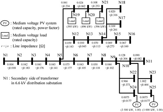 The effects of constant power factor control of PCS on the voltage have been compared using other distribution system models. Figure 15 presents another detailed one-line diagram of the three-phase 6.6 kV MV distribution system model that corresponds to the actual distribution feeder. Although large capacity PV systems are connected to nodes N24 and N25, the voltage reduction due to reverse power flow was not observed, and the voltage rise was observed.