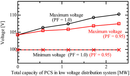 The voltage in all LV distribution systems connected to the MV distribution feeder was analyzed. The maximum and minimum voltages in all LV distribution systems during a 24-h period are summarized in Figure 18, which indicates that setting the power factor of PCS to 0.95 can mitigate the rise of the maximum voltage despite the capacity of PCS increasing. This can be explained by the fact that the constant power factor control of the PV system mitigates the overall voltage rise in the LV distribution system. Because the line resistance of the LV distribution system is sufficiently greater than its line reactance, the voltage reduction effect due to the reactive power loss of the PCS in the LV distribution system is smaller than the voltage increase effect due to the reverse active power flow. On the contrary, because the minimum voltage in the LV distribution system depends on the early morning load without PCS, the minimum voltage is constant with changes in the capacity of PCS.