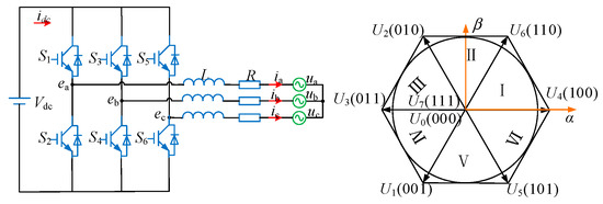 The topology and voltage vectors of a three-phase grid-connected converter.