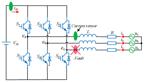 As shown in Figure 4, the current of dc, phase A, and phase C is sampled by the current sensor. Then the current of phase B can be obtained as −ia − ic based on the Kirchhoff Current Law (KCL). However, if one phase current sensor (taking phase C as an example) has a fault due to the harsh environment or aging sensors, then the current of phases B and C cannot be obtained, which leads to the control failure of the converter.
