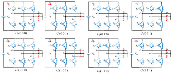 The switching state of the converter is defined as Si (i = a, b, c). When the upper switch of the i phase is on, Si = 1. If the lower switch of the i phase is on, then Si = 0. The output voltage under eight voltage vectors can be obtained as: