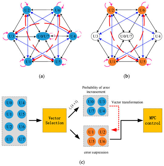 The voltage vector selections, including the traditional MPC and improved MPC method, are shown in Figure 6. As shown in Figure 6a, the vector selection method of traditional MPC selects the optimal voltage vector, which minimizes the cost function from seven different voltage vectors. The optimal voltage vector of the next sampling period may be other vectors or the same as the present vector. For example, the present vector U3(0 1 1) can be converted to any vector for the next interval based on cost function by a traditional MPC. The traditional MPC needs to calculate predictive current under six non-zero vectors and one zero vector at one sample interval, which leads to a high computational burden. Besides, if the voltage vector U3, U4 or zero voltage vector is used continuously at several intervals, the current reconstruction error is increased because the current of phase B is derived from the previous reconstructed current.