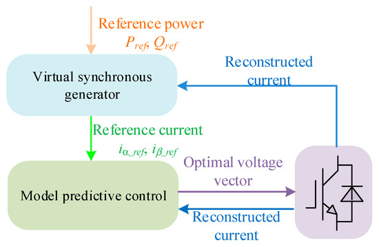 In this paper, the MPC and VSG are combined. The VSG outputs the reference current for MPC. Then the MPC controls the inverter to track reference current. The reconstructed current is obtained by inverter output dc and single-phase ac current with improved vector selection. Then the reconstructed current returns to VSG and MPC to achieve closed-loop control as shown in Figure 7. The former VSG realizes the power response for grid frequency and voltage. The latter MPC control is used for flexible current control of a grid-connected converter. The reconstructed current is used to improve fault-tolerant capability. The combined method can not only adjust the output current of the inverter, support the power grid for changes of frequency and voltage, but also improve the fault-tolerance ability of the inverter under sensor fault.