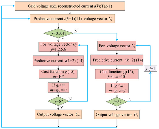 For a more detailed explanation of the MPC method, the flowchart of improved voltage selection is shown in Figure 9. Firstly, the dc current idc, ac current of phase A ia, and previous voltage vector Uj are collected. Then the three-phase reconstructed current is obtained by the current relationship. If the previous voltage vector Uj is U0, U3, or U4, then the optimal voltage vector is selected from U1, U2, U5, and U6 by substituting (k + 2)th instant predictive current values into the function (15). If the previous voltage vector Uj is other vectors, then the optimal voltage vector is selected from seven different vectors (U0~U6). Finally, the voltage vector which minimizes the cost function is the optimal vector and the corresponding switch state is applied for the converter.