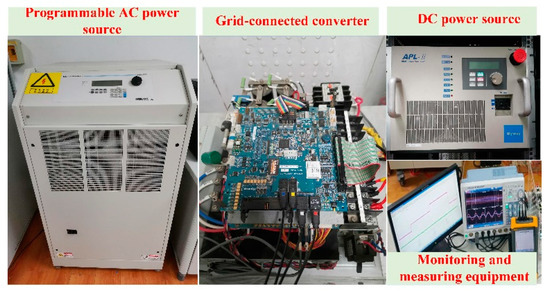 As shown in Figure 10, the experimental setup is established to verify the effectiveness of the proposed control method for the three-phase grid-connected converter. The dc power source APL-II is used to obtain a stable dc voltage. The programmable ac power source AMETEK MX-30 is used as grid voltage with adjustable frequency or amplitude. The experimental parameters are shown in Table 2.