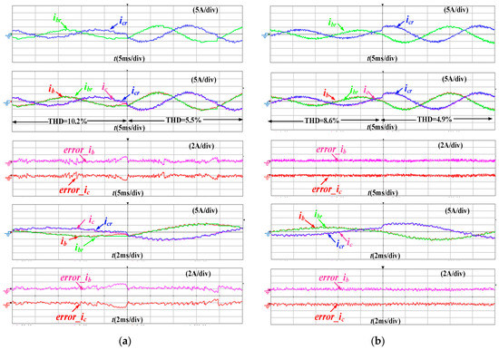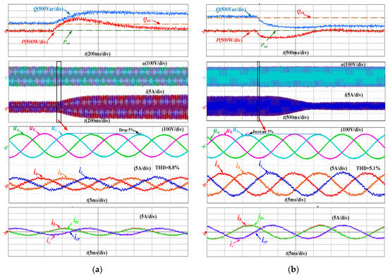 The reactive power-voltage regulation experimental results are shown in Figure 13. When the grid voltage sag occurs, the active power should increase to support the voltage recovery. As shown in Figure 13a, the output reactive power changes from the reference value 500 Var to about 1200 Var and the output active power approaches the set value 0 W within 1 s. The grid voltage is set to drop by 5% and the three-phase current is sinusoidal with 8.8% THD. Since the current of phase A and the dc side is sampled, the current of phases B and C is reconstructed. The reconstructed current ibr, icr, in Figure 13a is close to actual output current ib,ic, which confirms the validity of the current reconstruction effect.