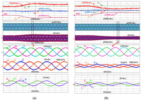 The experimental results with frequency decreasing are shown in Figure 12a. The reference power Pset = 500 W, Qset = 0. It can be seen from Figure 12a that the output power of the grid-connected converter can track the reference power stably before the frequency changes. When the grid frequency drops of 0.05 Hz, the frequency of VSG reaches the grid frequency in less than 0.7 s and the active power increases close to 1000 W to support the grid power. The three-phase grid current varies steadily without overcurrent impact and THD is 4.9% when Pset = 1000 W, which demonstrates the effectiveness of the proposed control method. The reconstructed current coincides with actual current basically, which shows the good effect of the current reconstruction method.