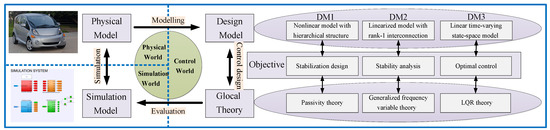 From the above discussion, LMC of IWM-EVs becomes an actual challenge. Fortunately, it is possible to apply the state-of-the-art of multi-agent system theories. Among them, the global (global/local) framework proposed by Hara group has been shown an effective way to model, analyze, and design multi-agent dynamical systems [30]. Several successful examples of glocal control are gene-regulatory network [31], platoon car [32,33], and manufacturing systems [34]. We recently developed a scheme in the glocal theory family, namely, hierarchical linear quadratic regulator (H-LQR), and applied it to optimal control of slip ratio for IWM-EVs in the acceleration mode [17]. The key of H-LQR is to utilize some special features in the structure of the multi-agent system to reduce the design cost. From the view point of glocal control framework, two critical issues still remain in the research field of LMC for IWM-EVs.