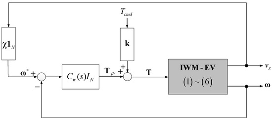 Firstly, almost the previous studies (including the works mentioned in Table 1) neglected the physical interaction between the wheel dynamics. For instance, in [22], Suzuki et al. introduced an anti-slip control by directly controlling the wheel velocity. The wheel velocity controller Cw(s) is merely designed by stable pole-placement to the closed-loop of Cw(s) and Pw(s) which represent the local wheel dynamics. In [25], Maeda et al. proposed the driving force control system for the four-IWM-EV. However, the system is just the combination of four decoupled wheel-velocity-based force control loops. In [11], Nam et al. independently design for each wheel a sliding-mode slip ratio controller. However, the design is based on the single wheel dynamics model without any relevant to the others. Actually, the physical interaction exists as the wheels are installed to the same car body. As clarified by a glocal control tool, namely “generalized frequency variable theory” [35], and its application to EV [36], neglecting physical interaction might reduce the system performance. Even if each wheel’s control loop is locally stable, this does not automatically guarantee the stability of the IWM-EV system as a whole. Therefore, it is essential to model the IWM-EV as an interconnected system of multi-agents to properly design the LMC.