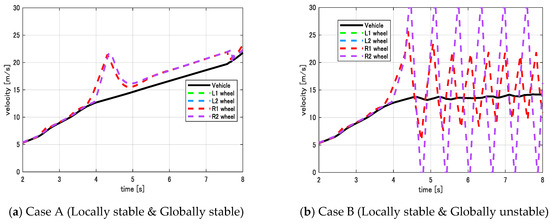 Case A: Two stable poles of Pcl(s) are placed at (Figure 5a). The wheel velocities are maintained closed to the vehicle velocity. This means the anti-slip function is successfully attained in this case.