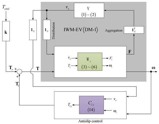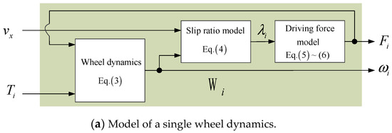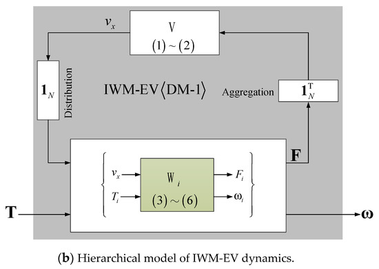 Based on (3)–(6), the model of the local agent Wi is shown as in Figure 6a. It includes two inputs {vx, Ti} and two outputs {Fi, ωi}. The vehicle body dynamics V is obtained from (1) and (2). V has the input which is the aggregation of the local driving force, and the output vx which is distributed to the local Wi. Combining {Wi} in the lower-layer and V in the upper-layer, the DM-1 is established as in Figure 6b with the hierarchical structure.