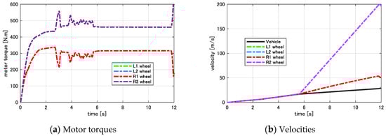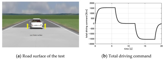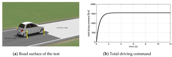 To evaluate the above design strategy, a test is conducted as follows. A constant driving command Tcmd is equally distributed to four wheels such that the EV accelerates from the initial position on the high friction surface (μ = 0.8). It enters the low friction surface (μ = 0.2) at about 4 s. Two test cases are performed, and their results are summarized in Figure 5.