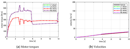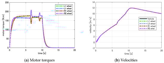In Figure A3, we demonstrate an experimental result of the wheel velocity control system in Figure 9. This was an autonomous driving test in which the vehicle is required to accelerate to the velocity of 5 m/s and then, maintaining this velocity constantly. To this end, the driving command is given by the upper-layer motion control layer. To design the PI controller for controlling the wheel velocity, we apply the Stability condition 8 in case N = 2. Thanks to this condition, we can stabilize the overall system and smoothly attain both the global motion and local motions of the vehicle.