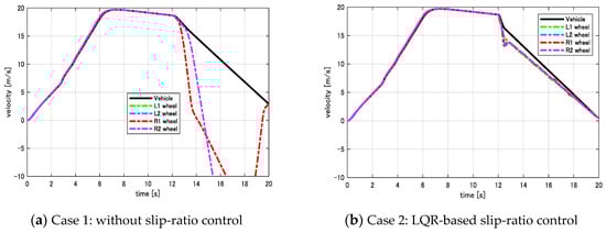 In the acceleration mode (), a sharp increasing of λ means a sharp increasing of S. Thus, to attain a given velocity pattern vx in the acceleration mode, it is required to use more electric energy from the battery. Next, we examine the deceleration mode (). In this case the side of λ is negative. A drastic decreasing of λ (or increasing of −λ) results in a drastic decreasing of S. Thus, to attain a given velocity pattern vx in the deceleration mode, only small amount of energy can be regenerated back to the battery. In summary, the driving range of electric vehicles would be considerably reduced if we wasted energy by neglecting anti-slip control.