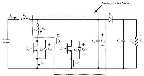 Figure 1 displays the proposed soft switching boost converter, which is constructed by one traditional boost converter along with one auxiliary switch module. The former is constructed by one input inductor Lin, one main switch S1 along with one body diode D1, one output diode Do, and one output capacitor Co. The latter is established by one auxiliary switch S2 along with one body diode D2, one resonant diode Dr, one resonant inductor Lr, one resonant capacitor Cr. The output load is represented by one resistor RL.