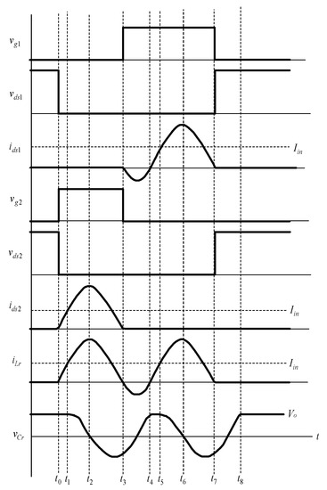 As displayed in Figure 2 and Figure 7a, S1 is switched on, but S2 is switched off. Since the voltage on S1 is clamped at zero in state 3, S1 is switched on with ZVS. In this time interval, iLr is negative with a peak value of Iin − Vo/Zr. Once iLr is zero again, the operation moves to state 5. The time elapsed is derived below.