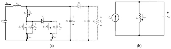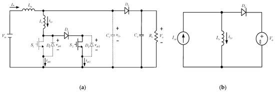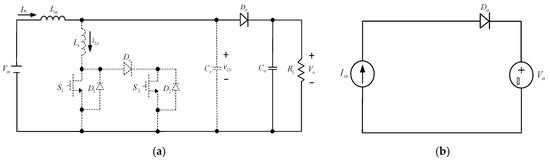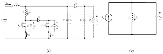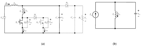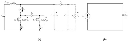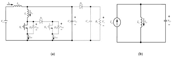 As displayed in Figure 2 () and Figure 3a, both of S1 and S2 are in the off state. Before S2 is switched on, the current Iin will flow through Do. In this time interval, the voltage imposed on Cr is the voltage Vo. Once S2 is switched on, the operation proceeds to state 1. Two state equations for state 0 is
