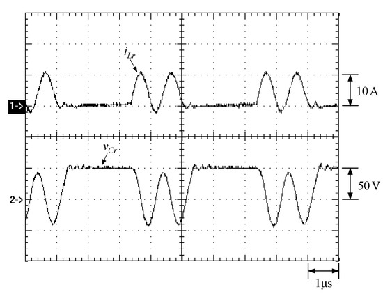 At rated load, Figure 12 displays the PWM signals vg1 and vg2 for S1 and S2; Figure 13 displays the PWM signal vg1 for S1, the voltage on S1, named vds1, and the current in S1, named ids1; Figure 14 shows the PWM signal vg2 for S2, the voltage on S2, named vds2, and the current in S2, named ids2; Figure 15 displays iLr and vCr. In Figure 12, we can see that the switch-on instant for S2 is prior to that for S1. In Figure 13, we can see that S1 has ZVT switch on and ZCS switch off. In Figure 14, we can see that S2 has ZCS switch on and ZCS switch off. In Figure 15, we can see that VCr and iLr have two resonant cycles per one half of PWM cycle and no resonant cycles per the other half of PWM cycle.