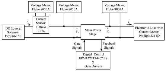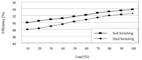 Moreover, Figure 16 displays how to measure the efficiency. First of all, the input current Iin is obtained by using one digital meter called Fluke 8050 A to measure the voltage across the current sensor. Afterwards, the input voltage Vin is attained by another digital meter. Hence, the input power is equal to the product of Vin and Iin. As for the output power, the output current Io is obtained from the electronic load and the output voltage Vo is attained by the other digital meter. Therefore, the output power is equal to the product of Vo and Io. Finally, the resulting efficiency can be attained. Figure 17 shows the relationship between efficiency and load. In Figure 17, we can see that the maximum difference in efficiency between soft switching and hard switching is about 2%. Figure 18 shows a photo of the experimental setup.
