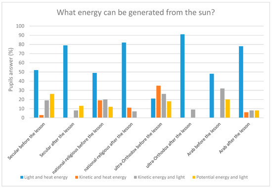 For example, when asked what types of energies can be generated from the sun, in the trivia questions before the lesson, about 50% of the pupils in the various secular, religious and Arab societies knew the correct answer. In the Haredi (ultra-Orthodox) society, only about 20% knew the answer. However, following the lesson, about 80% of the pupils learned and knew the correct answer, especially in the Haredi (ultra-Orthodox) group who started without prior knowledge. After the lesson, 90% of the pupils seemed to choose the correct answer (
