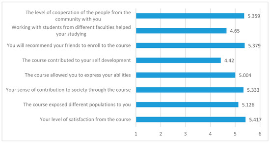 Finally, the students’ feedback meeting and reports gave a fascinating insight on their experience studying the course. They sensed and appreciated the fact that it was an action-learning course in which they were actively involved and could express their abilities for the benefit of the community. Several students, especially from the secular sector, expressed how meaningful the encounter with a different society to their own was for them, as they were exposed to previously unfamiliar aspects of Israeli life. They gave constructive notes for improvement for future “Green Ambassadors” courses, and said they would recommend the course to their friends. The students marked the various aspects of the course in a 1-to-6 ranking scale (