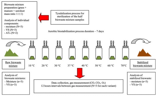 The experiments were performed in laboratory conditions, in fixed temperature bioreactors, in triplicates, at the following temperatures: 10, 25, 30, 37, 40, 50, 60, and 70 °C, in sterile (abiotic) and non-sterile (biotic) conditions. For each bioreactor, 50~55 g of mixed biowaste was placed in the climatic chamber (POL-EKO, model ST-3, Wodzisław Śląski, Poland) under constant temperature conditions. The climatic chamber also shielded the bioreactors from natural light. The tests were carried out in 1 L bioreactors. The tyndalization method was used for biowaste sterilization—material in reactors was placed in the dryer for 1 h at 105 °C, 3 times with 24 h intervals. Figure 1 shows the experimental set-up.