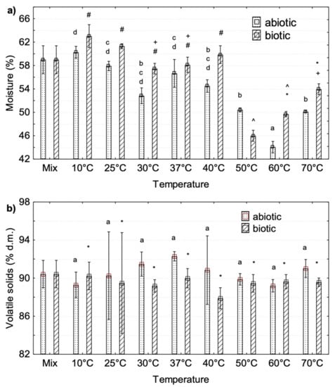 (a) Moisture content in biowaste (Mix—before the experiment) and residual biowaste after biowaste aerobic biostabilization under biotic and abiotic conditions under different thermal conditions,(b) volatile solids content in biowaste (Mix—before the experiment); letters and symbols (a, b, c, d, *, +, #) indicate homogeneity group according to Tukey’stest at significance level p < 0.05 (abiotic and biotic variant, respectively). The error bars are showing +/− standard deviation around the mean.