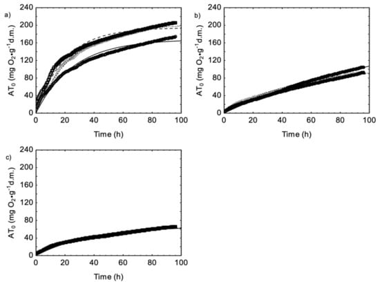 Both two types of substrates (grass and manure) and the resulting biowaste mixture used in experiments were characterized by high respiration activity (Figure 3). The highest activity was obtained in the case of grass (188 mg O2·g−1d.m.), followed by manure (141 mg O2·g−1d.m.), and biowaste mixture (67.5 mg O2·g−1d.m.) (Table 1). The lowest AT4 value for biowaste mixture was caused by the addition of inert sawdust. The kinetic rate constant for the O2 demand of the obtained waste mixture was 0.026 h−1 (Table 1).