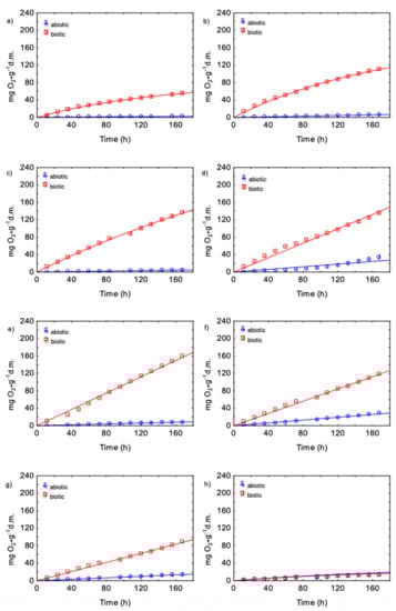 Cumulative O2 consumption depending on the temperature under abiotic and biotic conditions under different fixed temperatures (a) 10 °C, (b) 20 °C, (c) 30 °C, (d) 37 °C, (e) 40 °C, (f) 50 °C, (g) 60 °C, (h) 70 °C.The error bars are showing +/− standard deviation around the mean. Raw data are shown in Tables S1.1 and S1.2 (Supplementary Materials, sheet 1). The kinetic values are shown in Table S2.1 (Supplementary Materials, sheet 4). Equations used in figures are shown in Table A1. The Tukey test p < 0.05 are shown in Tables S3.1–S3.28 (Supplementary Materials, sheet 6).