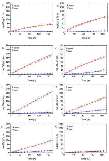 Cumulative CO2 production depending on the temperature under abiotic and biotic conditions under different fixed temperatures (a) 10 °C, (b) 20 °C, (c) 30 °C, (d) 37 °C, (e) 40 °C, (f) 50 °C, (g) 60 °C, (h) 70 °C. The error bars are showing +/− standard deviation around the mean. Raw data are shown in Tables S1.3 and S1.4 (Supplementary Materials, sheet 2). The kinetic values are shown in Table S2.2 (Supplementary Materials, sheet 5). Equations used in figures are shown in Table A1. The Tukey test p < 0.05 are shown in Tables S3.29–S3.56 (Supplementary Materials, sheet 8).