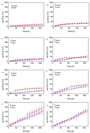 Cumulative CO production depending on the temperature under abiotic and biotic conditions under different fixed temperatures (a) 10 °C, (b) 20 °C, (c) 30 °C, (d) 37 °C, (e) 40 °C, (f) 50 °C, (g) 60 °C, (h) 70 °C. The error bars are showing +/− standard deviation around the mean. Raw data are shown in Tables S1.5 and S1.51 (Supplementary Materials, sheet 3). The kinetic values are shown in Table S2.3 (Supplementary Materials, sheet 6). Equations used in figures are shown in Table A1. The Tukey test p < 0.05 are shown in Tables S3.57–S3.84 (Supplementary Materials, sheet 9).