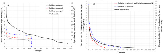 - thermal load for DHW production of the district (Figure 1b) has a duration of about 816 h, reaching a largest value of 163.2 kW;