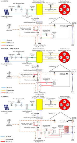 The schematics of the proposed configurations are reported in Figure 2a–e, where Figure 2a corresponds to the plant configuration named SCHEME 1, Figure 2b corresponds to both the plant configurations named SCHEMES 2 and 3, Figure 2c corresponds to the plant configuration named SCHEME 4, Figure 2d corresponds to both the plant configurations named SCHEMES 5 and 6, and Figure 2e corresponds to both the plant configurations named SCHEMES 7 and 8. In these figures, the following major components are indicated: end-users (6 houses), solar thermal collectors (SC), short-term vertical cylindrical thermal energy storage (STTES), seasonal single U-pipe borehole thermal energy storage (BTES), heat dissipator (HD), back-up system (BS), two counter-flow plate heat exchangers (HE1 and HE2), 6 local/decentralized individual non-condensing boilers (B) for DHW production (one per each building), 6 short-term DHW vertical cylindrical tanks (DHWT) integrated with an internal heat exchanger (IHE) to pre-heat the mains water (one per each building), fan-coils (FC), inverter/charge controller, electric batteries, pumps (P), 3-way valves and pipes.
