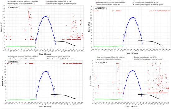 - when the solar energy stored into both the STTES and BTES is not able to fully cover the energy demands, a back-up auxiliary system is operated with the aim of supplementing the thermal energy needs in order to achieve the desired supply temperature level (55.0 °C);