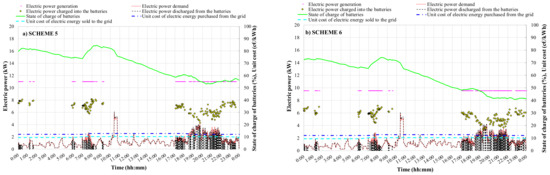 As highlighted in Figure 2a–e and Table 3, three-series connected electric energy storages are used for the SCHEMES 5–8 (all including a micro-cogeneration system as back-up unit), while the batteries are not used for the remaining four configurations (SCHEMES 1–4). Whatever the season is (during both heating and cooling periods), the cogenerated electricity is firstly used to cover the electric load for the SCHEMES 5–8. In the case of the MCHP electric output is bigger than the electric demand and state of charge of the batteries is 100%, then the cogenerated electricity is sold to the central grid. In the case of the charge level of the electric storages is lower than the maximum (100%), then the eventual surplus of electric energy generation with respect the electric demand is charged into the batteries. In the case of the cogenerated electric output is not enough to fully satisfy the electric needs, the electric storages are discharged only when their state of charge is larger than 10%; the electric storages discharging is interrupted in the case their state of charge becomes smaller than 10%. The grid is used to cover all peaks of electric demand in the case of the cogenerated electricity is not enough to fully cover the electric demand and the state of charge of the batteries is lower than 10%.