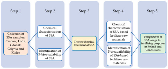 As it was mentioned before, despite the good fertilizer properties, according to the Polish restrictions the raw SSA is waste [53] that cannot be directly used in agriculture [52]. It is also underlined that fertilizers (granulated) obtained from ashes from biomass combustion and municipal sewage sludge have not been used for agriculture in the country so far, and they should be considered as substances “unknown in fertilization”. Therefore, the potential direct use of SSA as a fertilizer is not currently considered. It is also indicated that the chemical composition of the SSA needs to be investigated and monitored, because it is a variable material that contains significant amounts of P but also heavy metals and other contaminants (depending on the source of the sludge). Further studies are needed in this field to specify the instructions for its use and determining the size of the doses. Therefore, for now, the uncontrolled introduction to soils of granulated fertilizers obtained from SSA is prohibited. It is recommended to produce fertilizers in the processes of P extraction from SSA due to the obtained mineral fertilizers that may be placed on the market, according to the legal restrictions [51].