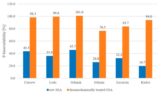 Bioavailable P is defined as the sum of the immediately available forms of P. The possible use of waste and waste-based products in the fertilizer sector has to be supported by the sufficient amount of nutrients that will be available to plants. Therefore, an assessment of P bioavailability should be conducted to correctly identify the fertilizing values of a given material [59]. In the current research, both the SSA and recyclates were examined to determine the P bioavailability. The results of the P bioavailability of the SSA produced in selected mono-incineration facilities and the respective fertilizer raw materials after thermochemical treatment are presented in Figure 2. The P-solubility in ammonium citrate of the untreated SSA was in the range 19.7% to 45.7%. The individual values reached 19.7% in SSA from Kielce; 26%—Gdynia; 32.3%—Szczecin; 35.9%—Lodz; 42.4%—Cracow; and 45.7%—Gdansk. These results indicate that the P in the untreated SSA is at least partially bioavailable. In German studies, the average values of the P bioavailability of raw SSA were 31.2% [42] and 35% [60]. It has to be pointed that these values are not sufficient for fertilizers, which ideally exhibit complete solubility of P in neutral ammonium citrate solutions [42]. The main P-bearing phosphate phase in SSA is poorly soluble tricalcium phosphates [29]. Therefore, a treatment to enhance the bioavailability of P in SSA is strongly recommended to obtain fully applicable products [61]. Previous research showed a high efficiency of the thermochemical process in increasing the P bioavailability of the SSA, reaching 82% [62] and 97% [50]. In the current study, the process of thermochemical treatment allowed to increase the values of the P bioavailability of the fertilizer products, reaching 76.5% for samples from Gdynia; 83.7%—Szczecin; 94%—Kielce; 98.3%—Cracow; 99.6—Lodz; and 101%—Gdansk. These results are indicated in Figure 2. The obtained fertilizer products contain P forms (CaNaPO4—buchwaldite) that are highly available for plants [29], which confirms the further possibility of the usage of thermochemical treatment in the production of secondary mineral P fertilizers. The reason for the relatively low PNAC solubilities in the cases of Gdynia and Szczecin are not clear yet. It should be further investigated if the P-bioavailability of these two plants could be increased towards 100%, e.g., by higher Na-additive dosing.