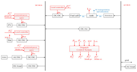 The topology of the multi-energy integrated system is shown in Figure 1, including the wind turbine, photovoltaic panel, hydrogen energy subsystem, battery and load. The black line in Figure 1 represents the power flow. The red line indicates the information flow, and the blue line shows the hydrogen flow. The red boxes represent the central and local controllers.
