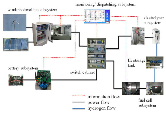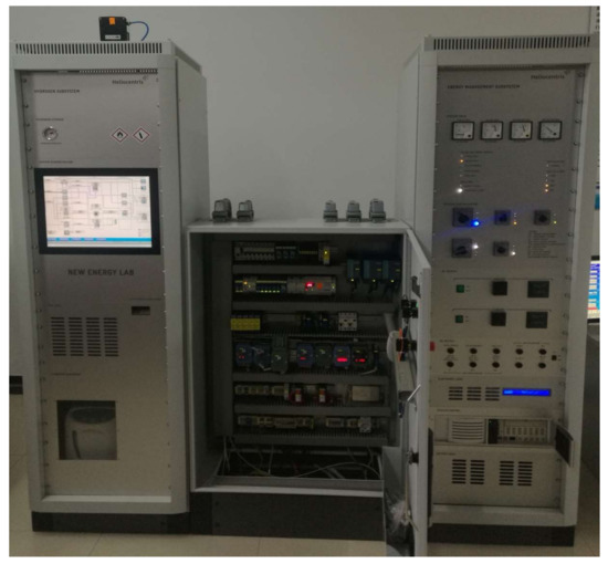 The integrated system equipment is shown in Figure 2. The left cabinet is the hydrogen energy subsystem, which includes an electrolyzer, a hydrogen storage tank, a fuel cell, and a safety device for monitoring hydrogen leakage. The right cabinet is the power subsystem. It includes a battery, a load, converters, and a controller. The middle part is the switch cabinet. It includes a relay, a transducer, and a data acquisition and network communication module.