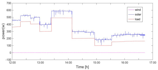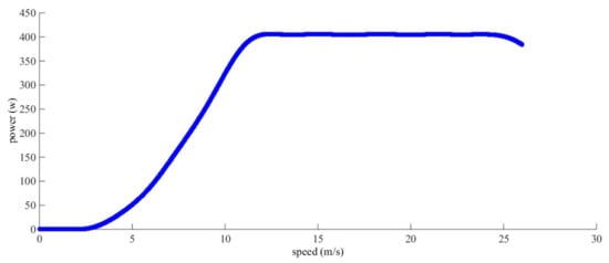 The pitch angle control is adopted to achieve the most efficient operation. The maximum power point tracking (MPPT) algorithm is based on power feedback and a climbing search [59]. The characteristic curve of wind speed output power is shown in Figure 4, which depicts the physical experiment.