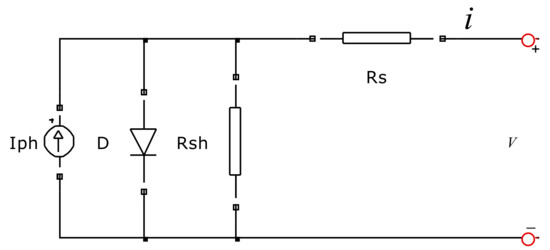 where Iph is the photocurrent, Isat is the diode reverse saturation current, Rs is the series equivalent resistance, Rsh is the parallel equivalent resistance, A is the diode factor, K is the Boltzmann constant (1.38 × 10−23 J/K), q is the electron charge (1.6 × 10−19 C), T is the absolute temperature of the photovoltaic cell, V is the output voltage, and I is the output current.
