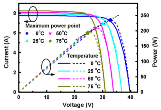 The I-V and P-V characteristic curves of the photovoltaic cell are shown in the Figure 6, and were obtained by the physical experiment. As the temperature rises, the open circuit voltage decreases and the short circuit current increases. Correspondingly, the maximum power point voltage and current all decrease. The MPPT strategy is based on the conductance increment and fuzzy logic [60].